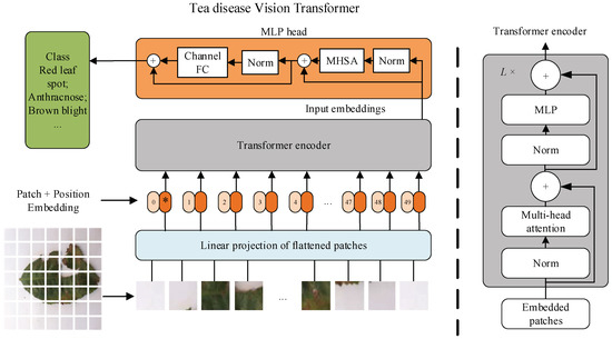 The rise of the transformer is mainly due to its good performance in the field of NLP. The attention mechanism solves the shortcomings of the recurrent neural network model, such as long short-term memory (LSTM) [22], it cannot be trained in parallel, and it requires a lot of storage resources to memorize the entire sequence of information [23]. The transformer uses an acyclic network structure and performs parallel computing through the encoder–decoder and self-attention mechanism, which greatly shortens the training time and improves the performance of machine translation [24]. Based on the transformer model [25,26,27], bidirectional encoder representations from transformers (BERT) [28] is designed for pretrain deep bidirectional representations from unlabeled text by jointly conditioning on both left and right context in all layers. As a result, the pre-trained BERT model can be finetuned with just one additional output layer to create state-of-the-art models for a wide range of tasks, such as question answering and language inference, without substantial task specific architecture modifications. The transformer is applied to computer vision to build a global information interaction mechanism, which helps to establish a more adequate feature representation. In addition, ViT also adopts the standard data flow form in the transformer, which facilitates efficient fusion with other modal data. The transformer-based vision model performs better than the convolutional neural network in image classification [29], object detection [30], image segmentation [31], video semantic understanding [32], image generation [33], and other fields. Figure 2 shows the model structure of the proposed ViT for tea diseases.