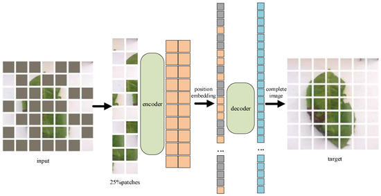 In this paper, an asymmetric encoder–decoder structure was used, and the structure of the decoder was smaller than that of the encoder, which can significantly reduce the pre-training time. The MAE structure of the tea disease images is shown in Figure 3.