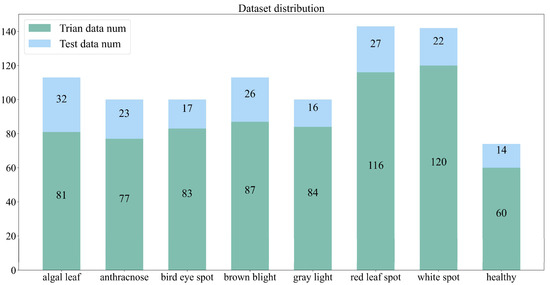 As shown in Figure 5, seven kinds of tea diseases and healthy image data are firstly divided into the training data set and test data set. The training data set accounts for 80% (including 708 pictures), and the test data set accounts for 20% (including 177 pictures).