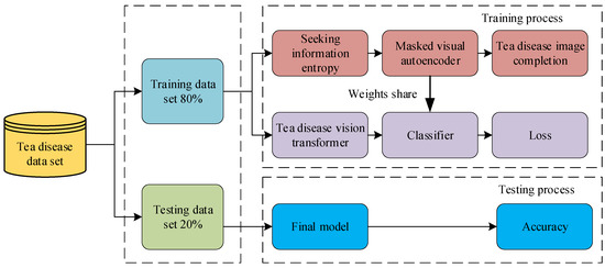Figure 6 shows the entire process of model training and testing. Two steps, including the feature extraction training and classifier training, were performed on the training set. In the feature extraction step, an IEW-based MAE was used to complete the masked tea disease image to obtain a complete tea disease image. Then, the information features and model parameters enhanced by the MAE were extracted and shared with the classifier. In the classification model training step, the parameters and informative features of the image completion model were loaded, and then the discriminator model was connected for complete model training. Finally, the trained model was verified to use the test set and obtain the model accuracy.