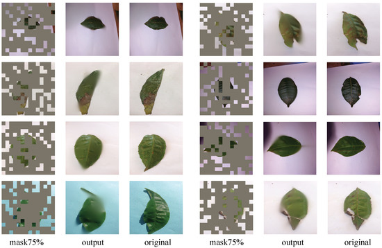 Slices with a resolution of 16 × 16 were masked during the autoencoder processing stage. The random method was used to mask 75% of the patches on the basis of the IEW. The masked patches were occupied by a 0 matrix, and only 25% of the patches in the image input to the model had the original data information. After training, the model could complete the masked missing information, so as to obtain the feature parameters required for the tea disease recognition. By randomly masking different parts of each image many times, the scale of the training data set was effectively increased, which resulted in the problem of overfitting being avoided, and the goal of learning more features for the model being achieved. The completion result is shown in Figure 7. It can be seen from Figure 7 that the input masked tea image data can be well completed, indicating that although only 25% of the original image data was input, the proposed IEM-ViT model could obtain enough tea disease feature information.