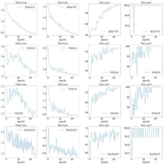 The proposed IEM-ViT model was compared with three current popular deep learning classification models including the VGG16, VGG19, and ResNet18. In order to ensure the validity of the experimental comparison, all models were trained with the same learning rate. The loss, top1 accuracy, and top5 accuracy of each model in the last 50 epochs during the training process were calculated, respectively. The results are shown in Figure 8. As can be seen from Figure 8, when comparing with the three classification models of VGG16, VGG19, and ResNet18, the proposed IEM-ViT model was more stable in terms of training loss and testing loss, and the loss value after model convergence was also smaller. In addition, the proposed IEM-ViT model had a top one accuracy of 93.78% and a top five accuracy of 100%.