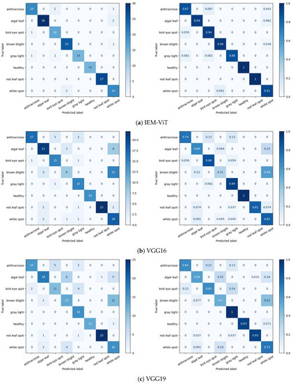 The experimental results showed that the recognition accuracy of the proposed IEM-ViT model for the seven types of tea diseases, including the algal leaf, bird eye spot, brown light, gray light, red leaf spot, and white spot, reached 87%, 94%, 94%, 96%, 88%, 100%, and 91%, respectively. The average accuracy rate was 93.78%, which is a nearly 20% improvement in comparison to the three currently main image recognition algorithms, including the ResNet18, VGG16, and VGG19. Additionally, in comparison to the published tea diseases method LeafNet, for the same types of tea diseases, the recognition accuracy is improved by 3.62%, and in comparison to the other five methods, our method can recognize more types of tea diseases and the accuracy is improved simultaneously.