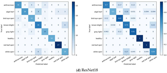 As shown in Figure 9b, for the VGG16 model, three samples of brown light were incorrectly identified as algal leaf and fifteen samples were incorrectly identified as white spot, with an accuracy rate of only 31%. This kind of tea disease has the worst recognition accuracy. As shown in Figure 9c, for the VGG19, two samples of brown light are incorrectly identified as algal leaf, and eleven samples were incorrectly identified as white spot, with a recognition accuracy of only 50%. As shown in Figure 9d, for the ResNet18, nine samples in the algal leaf were incorrectly identified as brown light, one sample was incorrectly identified as gray light, three samples were incorrectly identified as red leaf spot, three samples were incorrectly identified as white spot, and the recognition accuracy was only 50%. From the tea disease recognition confusion matrix in Figure 9, it can be seen that algal leaf and brown blight tea diseases were the most difficult to distinguish in the model.