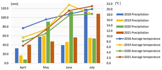The average monthly air temperature and total precipitation during the experiment in 2018–2021 at experimental orchard in Dąbrowice near Skierniewice.