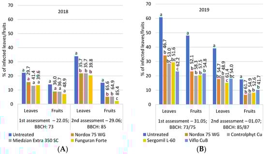 In the 2018 season, the tested fungicides limited disease on the leaves and on the fruits. During the first assessment, the efficacy of the tested fungicides (Table 1) in the protection of leaves was lower than 41.4%, and that in the protection of fruits was lower than 48.9%. However, statistical analyses did not show any significant differences between untreated plots and plots treated with the tested fungicides. During the second assessment, the efficacy of the tested fungicides in the protection of leaves was similar and ranged from 35.7–39.8%. In the protection of fruits, the highest efficacy (85.4%) was achieved with the application of Funguran Forte A-Plus NEW 50 WP (Figure 2A).