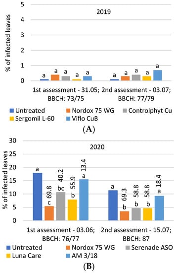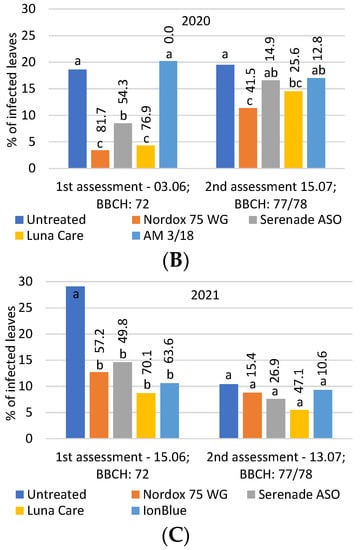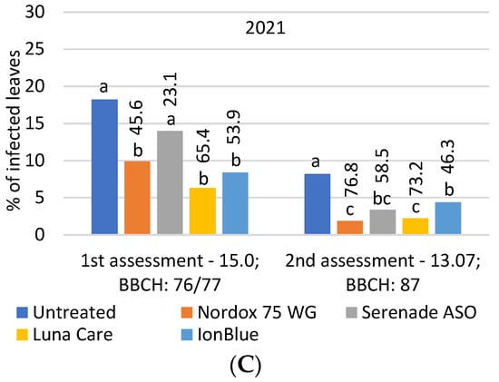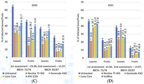 In the 2020 season, during all the assessments of leaves and fruits, out of all the tested products, Nordox 75 WG and Luna Care 71.6 WG showed the highest efficacy, while the lowest efficacy was observed for P. agglomerans AM3/18. In the case of Serenade ASO, the efficacy was variable depending on the date of assessment and plant organ (Figure 2C).
