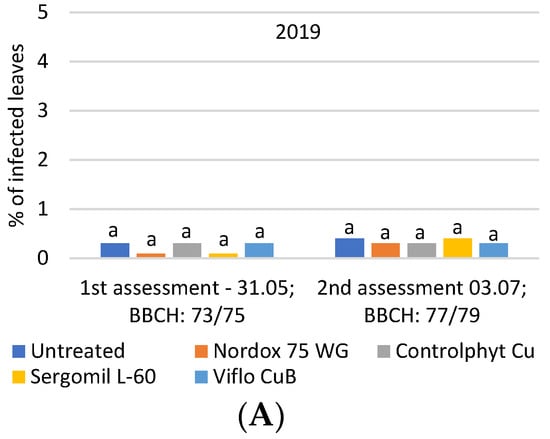 In the 2019 season, the tested products (Table 1) limited disease on the leaves and on the fruits. During the first assessment on leaves, the highest efficacy was achieved by the application of Viflo CuB with a value of 62.2%. Similar levels of efficacy were observed for Controlphyt Cu and Sergomil L-60, but lower levels were observed for Nordox 75 WG. In the protection of fruits, the efficacy of the tested products was similar and ranged from 52.1 to 58.3%. During the second assessment, the highest efficacy in leaf protection was observed for Sergomil L-60; the efficacy of this product was similar to that of Nordox 75 WG and Viflo CuB but higher than that of Controlphyt Cu. The efficacy of the tested products in the protection of fruits was similar to that in the protection of leaves, but statistical analyses did not show any significant differences between the tested products (Figure 2B).