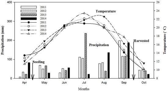 The experiments were replicated three times in a random block design. The maize cultivar (Zheng Dan 958) was sown on the 24th of April and harvested on the 15th of September in the four growing seasons (2011–2014). The plots were designed as 5 m wide × 6 m long. The maize was cultivated at three densities (60,000, 75,000 and 90,000 plants/ha) and wide–narrow row spacing (80 cm plastic film mulch; 40 cm row ledge). The content of effective inorganic components in the dry matter of manure is as follows: total C—362.1 g· kg, total N—20.3 g· kg, total P—18.2 mg· kg and total K—8.5 mg· kg. Plastic film mulch ensures the water and temperature are appropriate for seed emergence. Fertilization was conducted with combined chemical fertilizer and organic manure under three densities, and no manure application represents the control, as shown in Table 1. All of the experiments received the top application at the V6 stage with 90 kg/ha N. Precipitation and temperature during the growth period were recorded and shown in Figure 2.