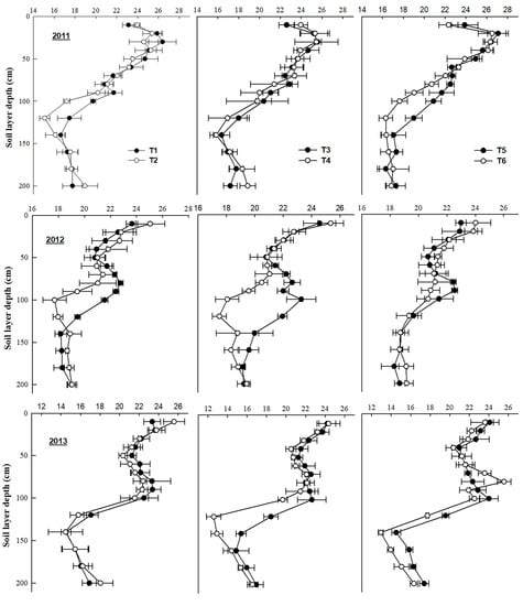 Dardanelli, Ritchie [] reported that the distribution and depth of the root system is closely correlated with the capability of crop roots to extract soil water. Root length density [,] and the depth of the most densely rooted soil layer are more important for coping with the shortage of soil water and nutrients. Water uptake partitioning over depth is highly correlated with root mass or length per unit volume of soil [,]. Changes in environmental water conditions will affect the water physiological characteristics of plants, including water consumption by transpiration, water potential and photosynthesis [,].