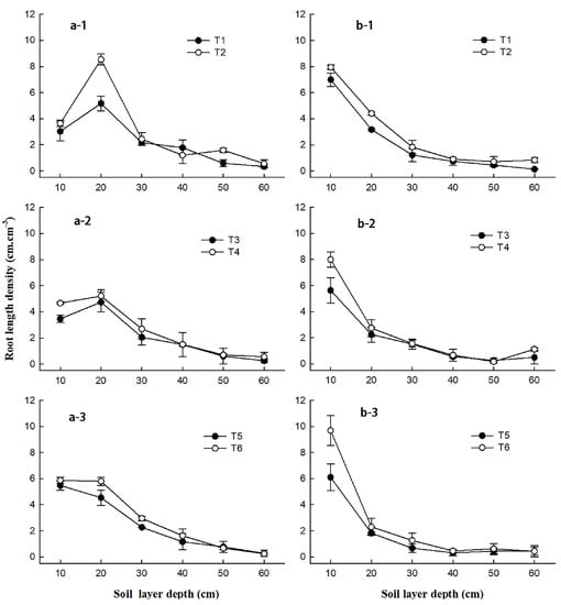 The means of RLD in three years are presented in Figure 4, and RLD increased significantly under organic manure, but the rates of increase decreases as the density is increased. Significantly higher RLD always occurred in the 0–50 cm soil layer under three planting densities, and below the 50 cm soil layer, RLD showed insignificant differences between conditions with and without organic manure. The most significant data affected by organic manure are shown in b-3, which is about 4 cm·cm higher than that without organic manure. The remaining five sets of data all show that the RLD with organic manure is about 1–3 cm·cm higher.
