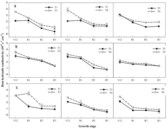 The root hydraulic conductivity (Lpr) from V12 to R4 of individual plants was measured using a high-pressure flow meter (HPFM, Dynamax Inc., Houston, TX, USA). At least three individual plants with similar morphological characteristics were selected, and their stems were cut at a height of 15–20 cm above the surface ground before measurements were conducted. Importantly, the stem sections were beveled before being installed in the vacuum spiral chamber that was linked to the HPFM via a plastic pipe and through which the water flowed to the stem section. All of the HPFM parts were under a vacuum at the beginning of the conductivity measurements. The HPFM was connected to a nitrogenous tank and a computer with HPFM analysis software. During the conductivity measurements, the water moved to the roots through the stem section, the pressure increased from 0 to 500 kPa, and the computer recorded the changes in the water flow and air pressure. We calculated the Lpr values based on the measured water flow and air pressure data to verify the variation in Lpr with competition under mixed cultivation.