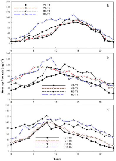 Stem sap flow measurement (heat balance) is an important technique for the study of plant water balances and represents a commonly used technique to monitor the sole transpiration term at the scale of a single plant [,,], and sap flow in individual stems show strong positive relationships with net radiation and leaf area [,,,]. Thermoelectric balance methods for measuring sap flow in plants are frequently applied in studies of plant water relations [] and to estimate plant transpiration, and ET represents the combination of water use from soil evaporation and transpiration from the plant [,,]. Three water measurement positions at different organs are used, leaf parameters, stem sap flow velocity and root hydraulic conductivity, to upscale the ET from the soil to plant leaf, and incorporating the canopy structure and the relationships between sunlit and shaded leaves was proposed [,]. Field experimental data have so far been seldom available for examining the effects of root distribution and pattern on both root water uptake and soil water status [,].