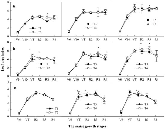 The LAI in all of the experiments was measured using an LAI-2200 instrument (LI-COR Inc., Lincoln, NE, USA) at several main growth stages (V6 jointing stage, V10 tenth leaves, VT flowering stage, R2 kernel blistering, R3 kernel milking, R4 kernel dough, R6 physiological maturity). In addition, the LAI was measured three times in the center of the test region on a fair-weather afternoon.