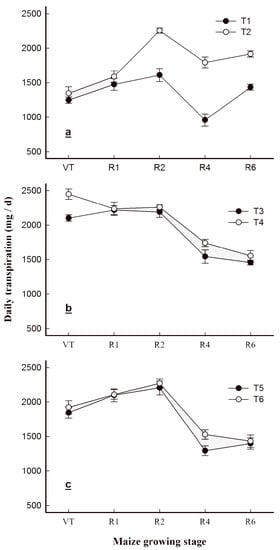 Crop transpiration rates were measured using sap flow sensors. Three stem flow gauges (models SGB 16, SGB19 and SGB25, Flow 32-1K; Dynamax Inc., Houston, TX, USA) were used with the energy balance method to measure sap flow in the maize stems [,,]. When the plants were 160–180 cm high with a stem diameter of 16–25 mm, three plants were selected for sap flow measurements. The flow sensors were installed on their stems at a height of 25–30 cm above the ground at pre-flowering stage when the plants were fully developed. After installation, the probes were sealed with silicon foam to prevent rain water intrusion and shielded with aluminum foil to avoid external thermal influences. Probe signals were read at 30 s intervals and recorded as 10 min averages on CR1000 data logger (Campbell scientific, Logan, UT, USA). The data were downloaded weekly from 15th of July (flowering stage) to 20th of September (at harvest) for analysis.