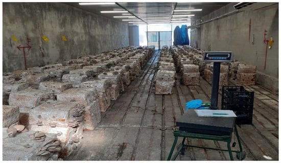 Bags were moved to a climate chamber for the incubation phase. The environmental conditions were maintained to optimum levels for P. ostreatus development (~20 °C for the colonization, ~13–15 °C for fruiting, and relative humidity 80–85%) as described by Oei (2003) [].