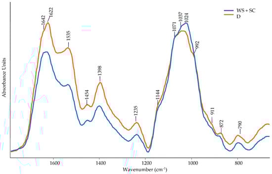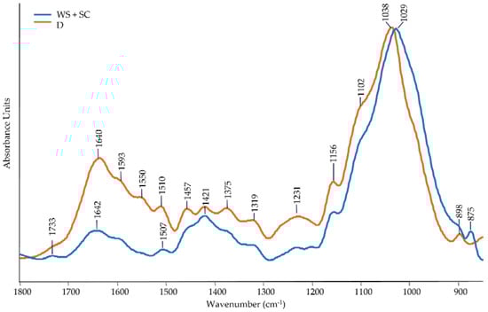 In addition, connected to the structure of the polysaccharides, there are two bands at 1421 cm−1 and 1319 cm−1 assigned to CH2 bending at C-6 of the crystalline cellulose, and a peak at 1375 cm−1 associated with CH2 bending vibrations in cellulose and hemicellulose []. A small band at 1733 cm−1 is observed, probably ascribed to the C=O stretching vibration in the ester linkage connected to the hemicellulose structure [,]. Lastly, the peak around 898 cm−1, in either WS + SC and D and that at 875 cm−1 in WS + SC, are related to C-H deformation in cellulose. Another fundamental compound detectable in both matrices is lignin. Although it is more evident in D, both spectra show two bands around 1590 and 1510 cm−1 attributed to the aromatic skeletal vibration and aromatic breathing in lignin, respectively []. The broad peak around 1640 cm−1 is possibly due to C=O stretching in conjugated ketones, water, and Amide I (proteins), while that at 1550 cm−1 is attributed to Amide II (proteins) [,].