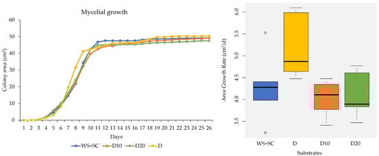 As a consequence of all the factors mentioned above and as previously analyzed by Fornito et al. (2020) [], initial tests in Petri dishes confirm the capability of the selected strain of P. ostreatus (WH90) of colonizing in the same way the conventional substrate (WS + SC) and the experimental ones (D10, D20, D). From the growing curves, it is indeed apparent that the trend of mycelia development is comparable in conventional plates as well as in those added with D and with pure D; nonetheless, in the first phase, D stimulates faster mycelial colonization.