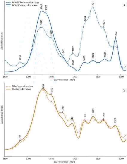 ATR-FTIR spectra (1800–1300 cm−1) of WS + SC (a) and D (b) before the mycelial growth (dotted line) and after P. ostreatus mycelial growth (solid line).