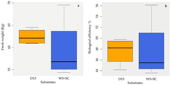 The bar chart in Figure 5a compares the summary statistics for the fresh weight average of the fruiting bodies harvested from the two substrates. The total yield for the conventional sample (WS + SC) was about 237.50 kg, while for the experimental one (D15) was about 249.60 kg of fruiting bodies. The ANOVA did not show any statistical differences between the fresh weight of the two groups. Furthermore, in Figure 5b, BE for each matrix is reported. Statistical analysis did not show any differences in this case as well, between the conventional matrix and the experimental one. Nevertheless, a slight increase in the fresh weight and more homogeneous results in terms of standard error can be noticed using D15.