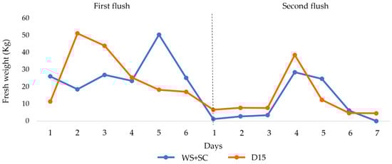Another parameter evaluated was P during the first and second flushes. Again, as can be seen from Table 2, we found no statistical differences between D15 and the control. Nevertheless, using the experimental substrate, higher percentages were achieved in the first half of both harvesting periods as well as more homogeneous values among replicates. Figure 6 presents the trend of the daily global production of each trial through the two flushes. Especially in the first one, it is immediately evident that D stimulates the production around days 2 and 3 instead of WS + SC, whose production reaches a peak around day 5. In the second flush, the two substrates tend to have almost the same trend, with the maximum production around day 4.