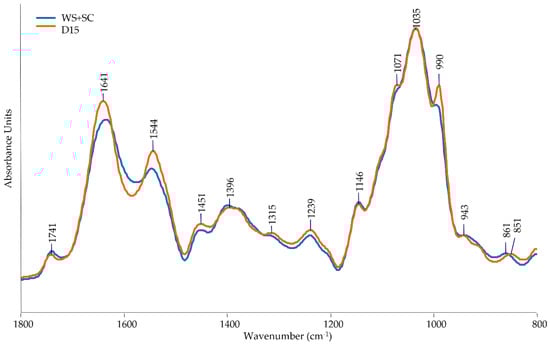 Figure 7 illustrates the ATR-FTIR spectra of the fruiting bodies of P. ostreatus harvested from the two growing substrates (WS + SC and D15). Overall, no significant differences were found between mushrooms produced on WS + SC and those on the experimental matrix. In both spectra are well evident the protein bands, including Amide I at 1641 cm−1, Amide II at 1544 cm−1, and Amide III around 1240 cm−1 [,]; however, a slight increase can be seen in those mushrooms cultivated with the addition of digestate. Furthermore, the region around 1000 cm−1, which corresponds to the polysaccharide vibration, is clearly apparent. For instance, the peak at 1146 cm−1, as well as that at 1035 cm−1, can be attributed to the C-O-C asymmetric stretching of glycosidic linkage and the stretching vibration of the C-O-C group, respectively []. The lipid component that can be found in cell membrane phospholipids, just like in the surface of the cap and stipe, can be observed at 1741 cm−1 and 1239 cm−1 due to the stretching of ester groups []. Along with this, the bands 1451 and 1239 cm−1 correspond to the aliphatic compounds.
