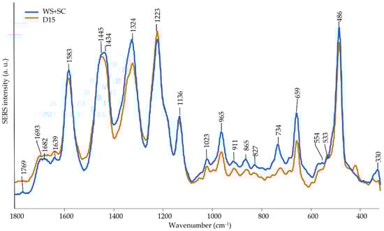 SERS spectra of the fruiting bodies of P. ostreatus harvested from the two growing substrates WS + SC (blue line) and D15 (orange line).