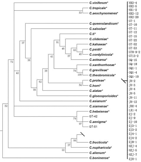 In the past, morphological characterizations (i.e., colony features, size and shape of conidia and appressoria, optimal temperature, growth rate) were used for the identification of Colletotrichum species [19,20,21]. However, because of the stability of morphological traits influenced by cultivation environments and the existence of intermediate forms, differentiation of Colletotrichum species based on morphological characters is not entirely reliable enough to distinguish between Colletotrichum species. Molecular techniques, such as polymerase chain reaction (PCR), real-time PCR, restriction fragment length polymerase (RFLP), and simple sequence repeat (SSR) markers have been developed to detect pathogens [15,22]. DNA markers based on ITS regions are always used to detect fungi, and the multi-loci phylogenetic analysis method was used to distinguish Colletotrichum at the species level [22,23,24]. Combining microbiological methods with molecular phylogeny led to a better understanding and identification of Colletotrichum species, which has been used for the identification of Colletotrichum species on many hosts [25,26,27].