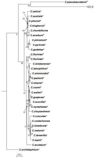 The remaining one isolate HZJ-6 and 31 reference isolates, including C. orchidophilum (CBS 632.80) as an outgroup, were subjected to multi-locus phylogenetic analyses with concatenated ITS, TUB2, ACT, CHS-I, and GAPDH sequences from those belonging to C. acutatum species complex. Finally, isolate HZJ-6 did not belong to the C. acutatum species complex and was clustered with C. pseudoacutatum (Figure 2).