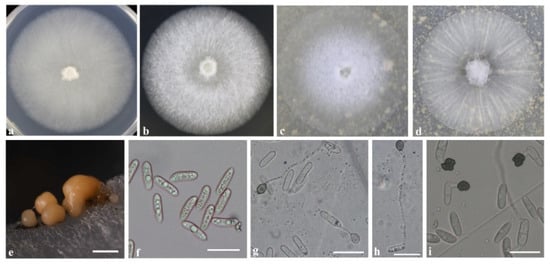 Culture characteristics and microscopic features of C. fructicola. (a,b) Seven-day-old of colonies on PDA and MEA medium, respectively. (c,d) Seven-day-old of colonies on OA medium. (e) Conidiomata on PDA medium. (f) Conidia. (f–i) Appressoria. Scale bars: (e) = 500 μm; (f–i) = 20 μm. (a–c,e–h): isolate GT-22; (d,i): isolate JH-2.