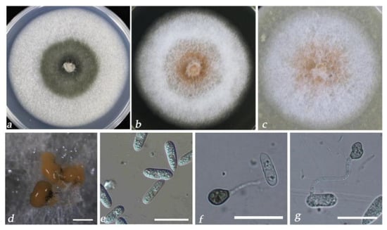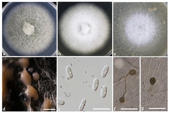 Culture characteristics and microscopic features of C. aenigma (isolate GT-42). (a–c) Seven-day-old of colonies on PDA, MEA, and OA medium, respectively. (d) Conidiomata. (e) Conidia. (f,g) Appressoria. Scale bars: (b) = 500 μm; (e–g) = 20 μm.