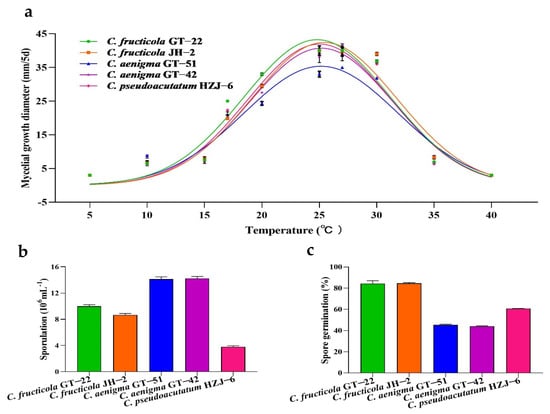 Five isolates selected for morphology observation were grown on PDA at 5 °C to 40 °C. The maximum colony diameter of C. fructicola GT-22, C. fructicola JH-2, C. aenigma GT-51, C. aenigma GT-42, and C. pseudoacutatum HZJ-6 after cultivation for 5 days on PDA was at 24.8 °C, 25.4 °C, 25.1 °C, 25.2 °C, and 25.0 °C, respectively (Figure 7a; Table S2). The temperature of 25 °C to 30 °C was suitable for the mycelial growth of C. fructicola and C. pseudoacutatum, and 25 °C to 27 °C was suitable for the mycelial growth of C. aenigma (Figure 7a, Tables S2 and S3).