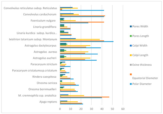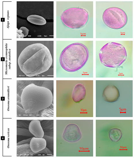 The micromorphological pollen features of selected 16 taxa from Turkey are summarized in Table 2 and Table 3. The pollen’s ultrastructure characteristic illustrations are shown in microscopic detail in Figure 3, Figure 4, Figure 5, Figure 6 and Figure 7.