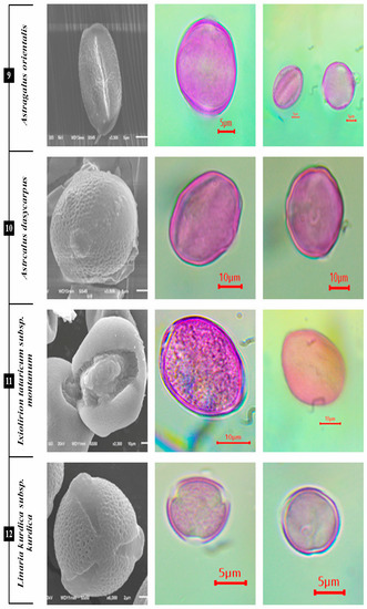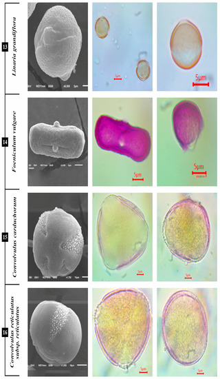 - Zafar, A.; Zafar, M.; Ahmad, M.; Khan, A.M.; Mahmood, T.; Kilic, O.; Fatima, A.; Habib, D.; Sultana, S.; Majeed, S.; et al. Microscopic (LM and SEM) visualization of pollen ultrastructure among honeybee flora from lower Margalla Hills and allied areas. Microsc. Res. Tech. 2022, 85, 3325–3338. [Google Scholar] [CrossRef]