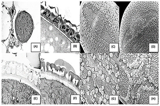 TEM micrographs: (A,B) A. reptans, (C) A. aucheri, (D) A. orientalis, (E) C. reticulatus subsp. reticulatus, (F) L. kurdica subsp. kurdica, and (G,H) R. caespitosa.