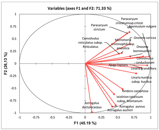 Principle component analysis (PCA) and cluster analysis (CA) were performed to identify the palynological data of taxa. The PCA was then performed with Varimax rotation using the matrix correlation configuration. The main components of the principal component analysis were PC1 with 45.19% and with PC2 26.13%, respectively. The total load of PC1 and PC2 was 71.33%. The Kaiser–Meyer–Olkin (KMO) method was conducted to examine the correlation of the variables. KMO was at 0.798, which is considered acceptable. Barlett’s test of sphericity also showed a statistical significance at alpha 0.04 for the data set. PCA analysis, which clarified the relationship between the taxa and pollen morphology, was explained with two possible groups (PC1 and PC2). The results are presented in Figure 9.