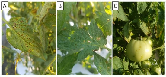 The tomato is the second most-consumed vegetable in the United States. Florida is the largest fresh market tomato producer in the country [1,2]. In 2020, Florida harvested 10,521 hectares, with a total value of USD 425 million [3]. In recent years, the industry has faced various challenges, including foreign competition [4,5,6], labor shortages [7,8], and the phasing out of the preplant fumigant methyl bromide for pest and disease management [9]. Bacterial spot of tomato (BST) is a major tomato disease that is caused by several species of Xanthomonas, including X. vesicatoria, X. euvesicatoria pv. euvesicatoria, X. euvesicatoria pv. perforans, and X. hortorum pv. gardneri, but composition varies globally [10]. In Florida, BST is caused by X. euvesicatoria pv. perforans (X. perforans) and has been a constant production challenge for growers due to Florida’s subtropical environment that can favor rapid disease development [11]. Common foliar symptoms of BST include small, dark-brown-to-black circular lesions on the leaves, stems, and inflorescent tissues (Figure 1). Under favorable weather conditions, the dead tissue in the center of leaf lesions can drop out, creating what is referred to as a shot-hole pattern [12]. The bacterium can also infect developing fruit, causing raised scabby lesions that render the fruit unmarketable and prone to secondary infections. However, compared to the outbreaks caused by X. hortorum pv. gardneri in the Midwest and Great Lakes regions of the United States [12,13], fruit losses associated with BST outbreaks caused by X. perforans are considered negligible [11].