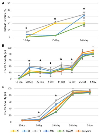 In 2019, treatment had a significant effect on disease severity from 13 September to 17 October. Disease severity for HI and LI remained statistically higher than the NI from 20 September to 4 October. The disease severity for NI was statistically equivalent to both HI and LI by 11 October, and equivalent to LI and less than HI at 17 October. Bactericide treatments differed from the NI control on 20 September and 11 and 17 October. Relative to the NI control, ASM and STR-ASM reduced the severity on 20 September. Cu-Manc also reduced severity on 11 October, but it increased severity on 17 October relative to the NI control. Treatment had no effect on disease severity after October 25, with progress plateauing.