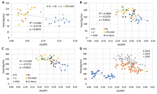 Correlation of bacterial spot disease progression based on relative area under disease progress curve (rAUDPC) to marketable yield across bactericide treatments during individual trials conducted in (A) 2018, (B) 2019, (C) 2020 and (D) across all seasons. Plot treatments included three inoculation treatments and three bactericide treatments. Inoculation treatments included a non-inoculated (NI) control and low inoculum (LI) and high inoculum (HI) treatments in which plots were inoculated either once after transplanting or were reinoculated every two weeks for six weeks after transplanting, respectively. The three bactericide treatments relied on natural inoculum movement from inoculated plots and included weekly applications of acibenzolar-lar-S-methyl (ASM), streptomycin sulfate + ASM (STR+ASM), or copper hydroxide + mancozeb (Cu-Manc). Linear trendlines were included for each trial, along with the corresponding coefficient of determination (R2), Pearson’s correlation (r), and statistical significance (p).