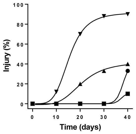 Injury rating curve (%) of different concentrations of smoke water in D. insularis. ● = 0%, ■ = 5%, ▲ = 10%, and ▼ = 20%. Linear regression was used to analyze data from the time–injury curve. These data were analyzed using R statistical package (Release 4.2.2).