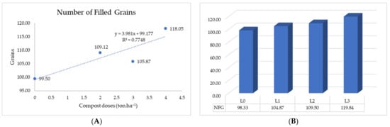 68]. Nevertheless, this figure already reflects the pivotal role of the compost treatment on the number of filled grains character, especially at the compost dosage level of four tons ha