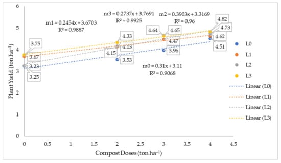 Figure 3A,B. Based on the compost treatment, the treatment combination showed a linear regression with a determination value of 0.7748 and a gradient of 3.981. The treatment of four tons ha