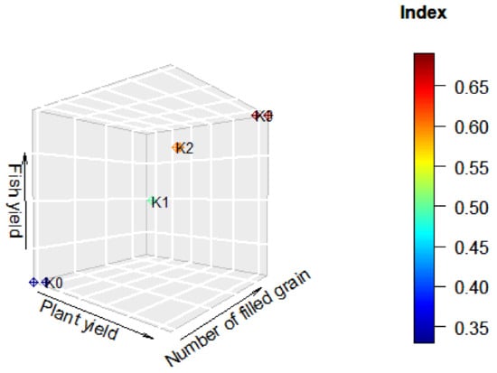The results of the 3D plot analysis focused on the three main characters, namely, the number of filled grains, rice yield, and fish yield (