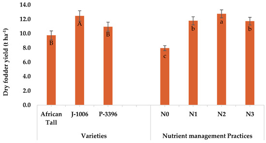 Dry fodder yield of maize varieties sown under different nutrient management practices (mean of two years). Note: Vertical bars labelled with different upper and lower-case letters shows significant variations among varieties and nutrient management practices, respectively using LSD (p = 0.05); Capped lines indicate the standard error of mean.