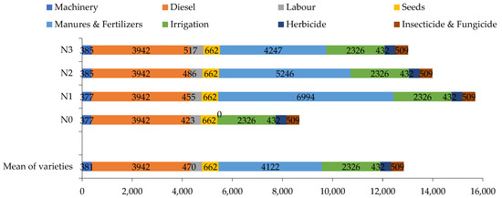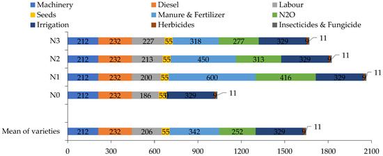 Energy is broadly classified into two groups based on their release patterns (direct and indirect energy) and resources (renewable and non-renewable energy). All the sources of energy (direct, indirect, renewable, and non-renewable energy) remained similar for all three varieties as identical resources were used to grow these varieties (Figure 6). In the present study, direct energy accounted for 55% of total energy, while indirect energy contributed only 45%. Similarly, renewable energy contributed only 22% of total energy inputs, while non-renewable energy accounted for a major share (78%). However, the scenarios for the contributions of energy sources were quite different for nutrient management practices. The contribution of direct and indirect energy sources ranged from 43 to 77% and 23 to 57% among nutrient management treatments (N0 to N3). With increasing the share of organic nutrients in the total nutrient application (N1 to N3), the direct source contribution was increasing, and results were reversed for indirect sources. Similarly, renewable and non-renewable energy sources accounted for 17–30% and 70–83%, respectively. Similar to direct and indirect energy sources, the renewable energy contribution was increasing with organic nutrient management compared with 100% RDF through chemical fertilizers, and a reverse trend was noticed for non-renewable energy sources.