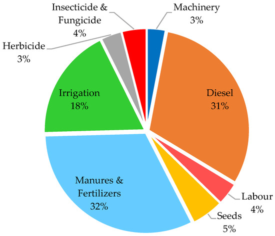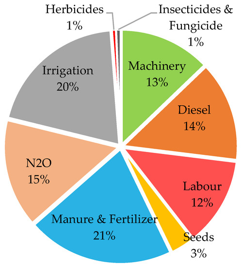 The carbon footprints in terms of spatial and yield basis for varieties under different nutrient management practices were determined to assess the environmental impacts due to fodder maize cultivation. Source-wise (machinery, diesel, labor, seeds, manures and fertilizers, N2O, irrigation, herbicide, and insecticides and fungicides) and operation-wise (field preparation, sowing, nutrient management, water management, weed management, plant protection, and harvesting), carbon consumption in terms of carbon emission equivalent (CO2-e) (CCE) were estimated using their respective equivalent carbon emission. The equivalent carbon emission (kg CO2-e unit−1) used in the present study for inputs and output were collected from various sources and presented in Table 3. However, carbon equivalents for each plant protection chemical are not available; therefore, the CCE is computed after assuming that the carbon emission in the production, transportation, storage and field application is the same for the protection chemical within a class [40,41].
