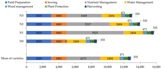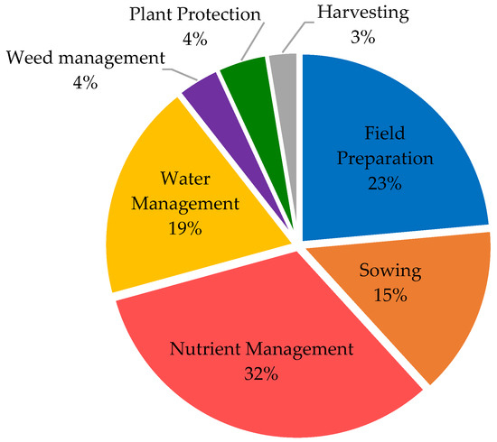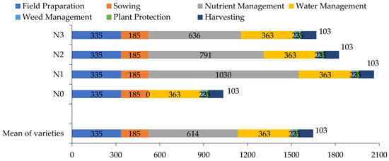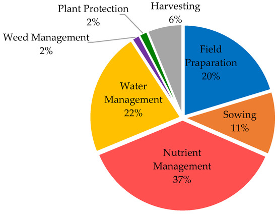 Operation-wise input energy estimation gives an idea about energy being consumed under various management practices. Similar to source-wise energy consumption, the operation-wise consumption was similar for all three varieties (Figure 4). Among all operations, nutrient management consumed the maximum energy, followed by field preparation and water management. The order of energy consumption was: nutrient management (4173 MJ ha−1) > field preparation (3029 MJ ha−1) > water management (2404 MJ ha−1) > sowing (1883 MJ ha−1) > plant protection (549 MJ ha−1) > weed management (471 MJ ha−1) > harvesting (335 MJ ha−1). In nutrient management practices, the highest energy consumption was found in nutrient management and ranged from 4349 to 7025 MJ ha−1. It indicates how nutrient management is important for fodder maize. Figure 5 indicates the operation-wise mean share of inputs energy. Nutrient management accounted for the maximum share (32%), followed by field preparation (23%), water management (19%), and sowing (15%). Nevertheless, the contribution of harvesting, plant protection, and weed management was ≤4% in this study.