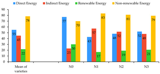 Percentage share of direct, indirect, renewable, and non-renewable energy sources to different nutrient management treatments and mean of varieties (mean of two years).