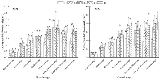 Changes of AGDB of winter wheat in two-year experiment. Note: T1: No irrigation. T2: Irrigation at jointing stage. T3: Irrigation at jointing stage and flowering stage. T4: Irrigation at jointing stage and later grain-filling stage. T5: Irrigation at jointing stage, flowering stage, and later grain-filling stage. The error bars are the standard deviation. The Tukey method was used for multiple comparison. Lowercase letters indicate that the difference reaches a significance level (p < 0.05), that is, in five treatments at a certain growth stage, having the same letter between any two treatments means that the difference between the two treatments is not significant, while not having the same letter means that the difference between the two treatments is significant.
