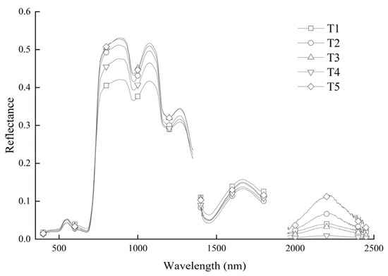 Figure 2 shows the spectral reflectance curve under different irrigation treatments. The spectral bands in the range of 350–399 nm, 1351–1399 nm, 1801–1950 nm, and 2451–2500 nm were eliminated in order to reduce the effect of factors such as moisture in the air. It can be seen from the figure that the original spectrum of winter wheat canopy basically increased first and then decreased with the increase in wavelength. Among them, a small reflection peak was formed near 550 nm in the visible light area, a near-infrared reflection platform was formed within 780–1100 nm, and two obvious absorption valleys were formed near 1000 nm and 1450 nm, which conforms to the basic characteristics of spectral reflectance of the green plant canopy. However, at the same wavelength, there were certain differences in spectral reflectance between different treatments. Taking the near-infrared reflection platform as an example, we can see that the spectral reflectance of the T1 treatment without irrigation was the lowest. The T4 and T2 treatments irrigated once at the jointing stage were higher than the T1 treatments, and the T3 and T5 treatments irrigated twice at the jointing stage and flowering stage were the highest.